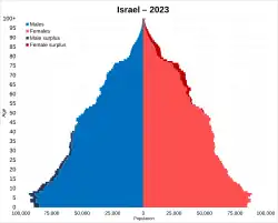 ![]() Population pyramid of Israel, 2023 (numbers by age group) | |