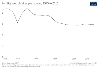 Israel's annual population growth rate stood at 2.0% in 2015, more than three times faster than the OECD average of around 0.6%.[3] With an average of three children per woman, Israel also has the highest fertility rate in the OECD by a considerable margin and much higher than the OECD average of 1.7.[4]