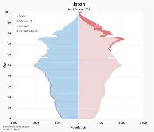 According to a demographic study conducted by Japanese Ministry of Internal Affairs and Communications, the Japanese population, including foreign residents, declined from 128 million people in 2010 to 124.3 million people in 2023, with a decrease of almost 511,000 people in one year.[18][19]