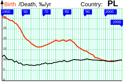 Since 1990, Poland's population stagnated at 38.0-38.6 million, with the median age rising due to low birth rates. Official population statistics are a point of debate in Poland,[17] though, with many academics criticizing the Polish Central Statistical Office (GUS) for failing to adapt to successfully capture internal and international migration in particular.[18][6] Already the 2002 census revealed Poland had 402,000 residents less than expected,[19] and subsequent censuses reflected neither the mass emigration of Poles after Poland's admission to the European Union in 2004, nor the mass immigration to Poland since 2014.[20]