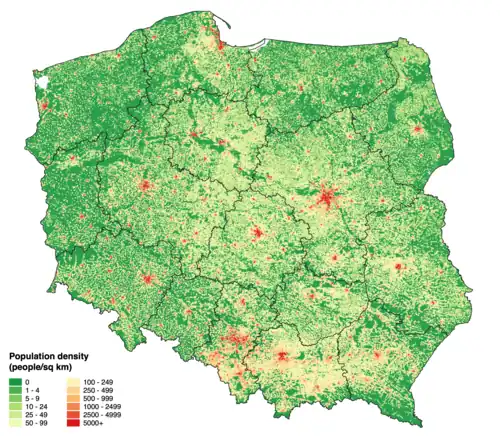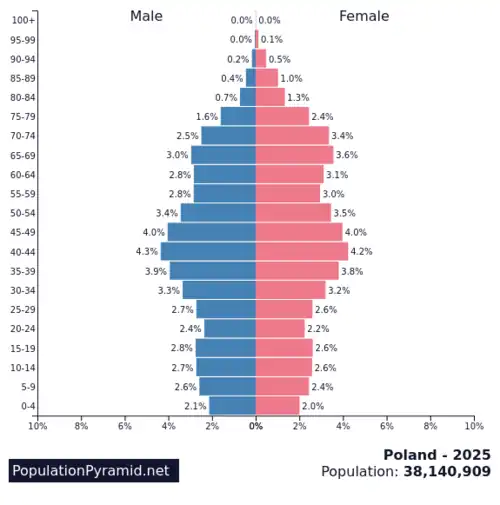 As of 31 December 2024, the population of Poland was 37,489,000,[1] while the usually resident population was 36,497,495.[3] The population has exhibited a negative growth rate of −0.42% per year. The population density was 119 people per square kilometer. The proportion of the population residing in urban areas was 59%, a figure that has been declining as a consequence of suburbanization. The sex ratio was 107 women per 100 men, 112 per 100 in urban areas, and 101 per 100 in rural areas. The median age was over 43 years (nearly 42 years for males and 45 years for females).[1]