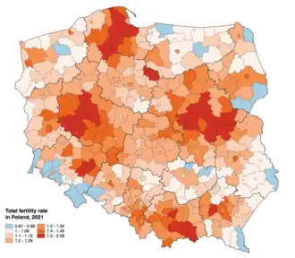 Total fertility rate varies significantly by county in Poland. In 2021, Kashubia and Nowy Sącz regions had the highest fertility rate, along with metropolitan areas of Warsaw and Poznań. The lowest, sub-1 fertility was recorded in the Sudetes.