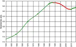 Between 1993 and 2008 there was a great decrease in the country's population from 148 to 143 million.[42] There was a huge 50% decrease in the number of births per year from 2.5 million in 1987 to 1.2 million since 1997, but the current 1.42 fertility rate is still higher than that of the 1990s.[42]