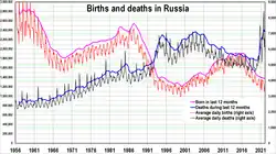 The natural population had declined by 997,000 between October 2020 and September 2021 (the difference between the number of births and the number of deaths over a period).[29] The natural death rate in January 2020, 2021, and 2022 have each been nearly double the natural birth rate.[30]