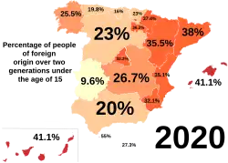 The arrival of migrating young adults was the main reason for the slight increase in Spain's fertility rate.[18] From 2002 through 2008 the Spanish population grew by 8%, of whom 75% were foreign.[19]