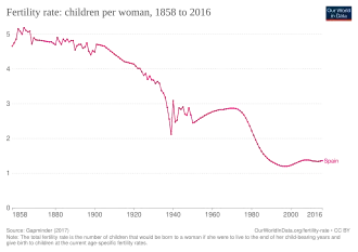 In 2023, the average total fertility rate (TFR) across Spain was 1.12 children born per woman, one of the lowest in the world.[10] However, despite the very low birth rate, which caused a marginal demographic decline in the mid-2010's, the negative natural change was compensated by a high immigration rate, which increased the population on its own since 2017.