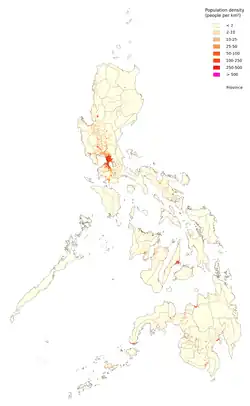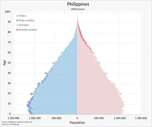 Demographic features of the Philippines include population density, ethnicity, education level, health of the populace, economic status, religious affiliations, and other aspects of the population. The Philippines annualized population growth rate between the years 2020 and 2024 was 0.80%.[2] According to the 2024 census, the population of the Philippines is 112,729,484.[2] The first census in the Philippines was held in the year 1591 which counted 667,612 people.[7]