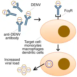 Infection with one serotype is thought to produce lifelong immunity to that type, but only short-term protection against the other three.[23] Subsequent re-infection with a different serotype increases the risk of severe complications due to a phenomenon known as antibody-dependent enhancement (ADE).[10][48] The exact mechanism of ADE is not fully understood.[48] It appears that ADE occurs when the antibodies generated during an immune response recognize and bind to a pathogen, but they fail to neutralize it. Instead, the antibody-virus complex has an enhanced ability to bind to the Fcγ receptors of the target immune cells, enabling the virus to infect the cell and reproduce itself.[48][49]