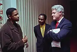 In 1996, he starred alongside Whitney Houston, and Courtney B. Vance in the romantic comedy The Preacher's Wife directed by Penny Marshall. The film is a remake of the 1947 film The Bishop's Wife starring Cary Grant, Loretta Young, and David Niven.[33] In 1998, Washington starred in Spike Lee's film He Got Game. Washington played a father serving a six-year prison term when the prison warden offers him a temporary parole to convince his top-ranked high-school basketball player son (Ray Allen) to sign with the governor's alma mater, Big State. The film was Washington's third collaboration with Lee.[34] The same year he starred in Gregory Hoblit's supernatural horror film Fallen (1998) with John Goodman, James Gandolfini, and Donald Sutherland.[35]