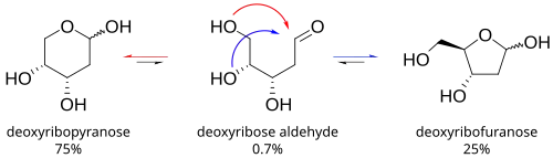 In aqueous solution, deoxyribose primarily exists as a mixture of three structures: the linear form H−(C=O)−(CH2)−(CHOH)3−H and two ring forms, deoxyribofuranose ("C3′-endo"), with a five-membered ring, and deoxyribopyranose ("C2′-endo"), with a six-membered ring. The latter form is predominant (whereas the C3′-endo form is favored for ribose).