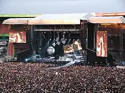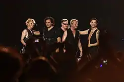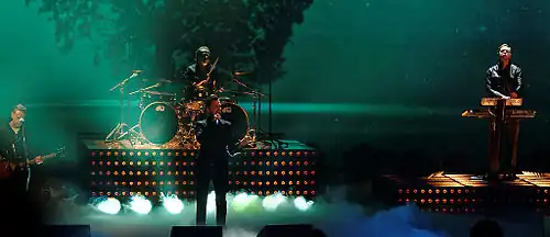 In May 2009, the band embarked on a concert tour in support of the album, called Tour of the Universe; it had been announced at a press conference in October 2008 at the Olympiastadion in Berlin.[100] There was a warm up show in Luxembourg and it officially started on 10 May 2009 in Tel Aviv. The first leg of the tour was disrupted when Dave Gahan was struck down with gastroenteritis. During treatment, doctors found and removed a low-grade tumour from the singer's bladder. Gahan's illness caused 16 concerts to be cancelled, but several of the shows were rescheduled for 2010.[101] The band headlined the Lollapalooza festival during the North American leg of the tour. The tour also took the band back to South America for the first time since 1994's Exotic Tour. During the final European leg, the band played a show at London's Royal Albert Hall in aid of the Teenage Cancer Trust, where former member Alan Wilder joined Martin Gore on stage for a performance of "Somebody".[102][103] In total the band played to more than 2.7 million people across 32 countries and the tour was one of the most profitable in America in 2009.[104][105] The concerts held at Palau Sant Jordi, Barcelona, Spain were filmed and later released on DVD and Blu-ray release entitled Tour of the Universe: Barcelona 20/21.11.09.[106] In March 2010, Depeche Mode won the award for "Best International Group – Rock / Pop" at the Echo Awards in Germany.[107]