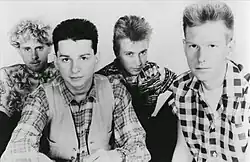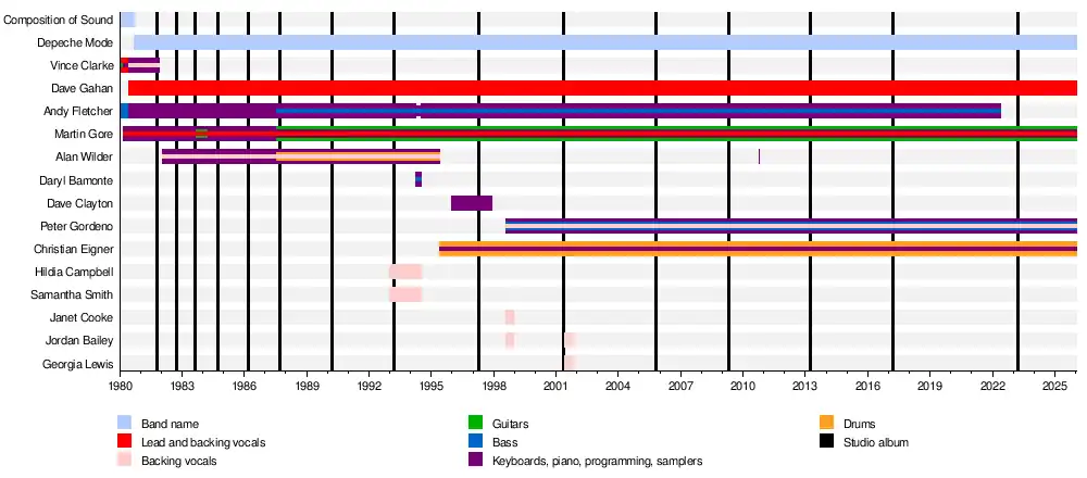 Depeche Mode's origins date to 1977, when schoolmates Vince Clarke and Andy Fletcher formed a band called No Romance in China with Clarke on vocals and guitar and Fletcher on bass. Fletcher would later recall, "Why am I in the band? It was accidental right from the beginning. I was actually forced to be in the band. I played the guitar and I had a bass; it was a question of them roping me in."[10] In 1979, Clarke played guitar in an Ultravox-influenced band, the Plan, with friends Robert Marlow and Paul Langwith.[11] In 1978–1979, Martin Gore played guitar in an acoustic duo, Norman and the Worms, with school friend Phil Burdett on vocals.[12] In 1980, Clarke and Fletcher formed a band called Composition of Sound, with Clarke on vocals/guitar and Fletcher on bass; the pair were soon joined by Gore as a third instrumentalist.[13] Dave Gahan joined the ensemble later in 1980 after Clarke heard him perform at a local Scout hut jam session, singing a rendition of David Bowie's "'Heroes'".[14]