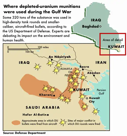 The US and NATO militaries used DU penetrator rounds in the 1991 Gulf War, the Bosnia war,[16] bombing of Serbia, the 2003 invasion of Iraq,[17] and 2015 airstrikes on ISIS in Syria.[18] It is estimated that between 315 and 350 short tons (286 and 318 t) of DU were used in the 1991 Gulf War.[19]