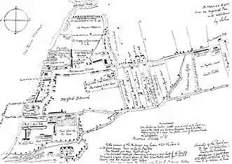 Diarist John Evelyn lived in Deptford at Sayes Court, the manor house of Deptford, from 1652 after he had married the daughter of the owner of the house, Sir Richard Browne.[21] After the Restoration, Evelyn obtained a 99-year lease of the house and grounds,[22] and laid out meticulously planned gardens in the French style, of hedges and parterres. In its grounds was a cottage at one time rented by master woodcarver Grinling Gibbons. After Evelyn had moved to Surrey in 1694, Peter the Great, the Russian tsar, studied shipbuilding for three months in 1698 while staying at Sayes Court.[16] Evelyn was angered at the antics of the tsar, who got drunk with his friends who, using a wheelbarrow with Peter in it, rammed their way through a "fine holly hedge". Sayes Court was demolished in 1728-9 and a workhouse built on its site.[22] Part of the estates around Sayes Court were purchased in 1742 for the building of the Navy Victualling Yard, which was renamed the Royal Victoria Victualling Yard in 1858 after a visit by Queen Victoria.[23] This massive facility included warehouses, a bakery, a cattleyard/abattoir and sugar stores, and closed in 1961. All that remains is the name of Sayes Court Park, accessed from Sayes Court Street off Evelyn Street, not far from Deptford High Street. The Pepys Estate, opened on 13 July 1966, is on the former grounds of the Victualling Yard.[24]