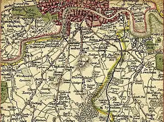 Deptford was part of the pilgrimage route from London to Canterbury used by the pilgrims in Chaucer's late 14th century Canterbury Tales, including a mention in the prologue to "The Reeve's Tale".[9] The ford developed into first a wooden then a stone bridge, and in 1497 saw the Battle of Deptford Bridge, in which rebels from Cornwall, led by Michael An Gof, marched on London protesting against punitive taxes, but were soundly beaten by the forces of King Henry VII.[10]