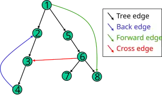 The result of a depth-first search of a graph can be conveniently described in terms of a spanning tree of the vertices reached during the search. Based on this spanning tree, the edges of the original graph can be divided into three classes: forward edges, which point from a node of the tree to one of its descendants, back edges, which point from a node to one of its ancestors, and cross edges, which do neither. Sometimes tree edges, edges which belong to the spanning tree itself, are classified separately from forward edges. If the original graph is undirected then all of its edges are tree edges or back edges.