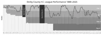 One of the 12 founder members of the Football League in 1888, Derby County is one of only nine clubs to have competed in every season of the English football league system (126 seasons up to the end of the 2024–25 season), with all but six of those being in the top two divisions.