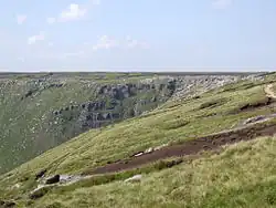 Some areas of the White Peak exhibit contemporaneous basalt flows (e.g. Ravens Tor at Millers Dale), as well as subsequent dolerite sill intrusion at a much later stage (e.g. near Tideswell Dale),[20] whilst mineralisation of the carboniferous limestone in a subsequent period created extensive lead and fluorite deposits which have formed a significant part of Derbyshire's economy, as did coal mining. Lead mining has been important here since Roman Times.[21] The more recent river gravels of the Trent valley remain a significant extractive industry today in south Derbyshire, as does the mining of limestone rock in central and northern parts of the county.[22] Coarse sandstones were once extensively quarried both for local building materials and for the production of gritstone grinding wheels for use in mills, and both former industries have left their mark on the Derbyshire landscape.