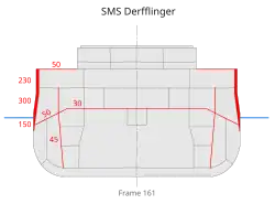 - ^ Anti-roll tanks were fitted only to Derfflinger, because during the initial trials on the battlecruiser Von der Tann, the roll tanks were found to reduce rolling by only 33%. This was deemed to be an insufficient benefit to warrant the extra weight of the roll tanks. The roll tanks also required the removal of two secondary-battery guns.[14]