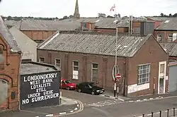 Apart from the name of the local council, the city is usually[31] known as Londonderry in official use within the UK. In the Republic of Ireland, the city and county are almost always referred to as Derry, on maps, in the media and in conversation.[35] In April 2009, however, the Republic of Ireland's Minister for Foreign Affairs, Micheál Martin, announced that Irish passport holders who were born there could record either Derry or Londonderry as their place of birth.[36] Whereas official road signs in the Republic use the name Derry, those in Northern Ireland bear Londonderry (sometimes abbreviated to L'derry), although some of these have been defaced with the reference to London obscured.[37] Usage varies among local organisations, with both names being used. Examples are City of Derry Airport, City of Derry Rugby Club, Derry City FC and the Protestant Apprentice Boys of Derry, as opposed to Londonderry Port, Londonderry YMCA Rugby Club and Londonderry Chamber of Commerce.[38] The bishopric has always remained that of Derry, both in the (Protestant, formerly-established) Church of Ireland (now combined with the bishopric of Raphoe) and in the Roman Catholic Church. Most companies within the city choose local area names such as Pennyburn, Rosemount or Foyle from the River Foyle to avoid alienating the other community. Derry~Londonderry railway station is often referred to as Waterside railway station within the city, but is called Derry/Londonderry at other stations. The council changed the name of the local government district covering the city to Derry on 7 May 1984, consequently renaming itself Derry City Council.[39] This did not change the name of the city, although the city is coterminous with the district, and in law the city council is also the Corporation of Londonderry or, more formally, the Mayor, Aldermen and Citizens of the City of Londonderry.[40] The form Londonderry is used for the post town by the Royal Mail;[34] however, use of Derry will still ensure delivery.