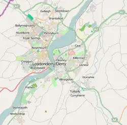 The population of the city was 85,279 in the 2021 census,[11] while the Derry Urban Area had a population of 105,066 in 2011.[12] The district administered by Derry City and Strabane District Council contains both Londonderry Port and City of Derry Airport. Derry is close to the border with County Donegal, with which it has had a close link for many centuries. The person traditionally seen as the founder of the original Derry is Saint Colmcille, a holy man from Tír Chonaill, the old name for almost all of modern County Donegal, of which the west bank of the Foyle was a part before 1610.[13]