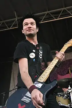 Whibley uses a black customized '72 Fender Telecaster Deluxe live with his well-known red X's for decoration and good luck.[19] He has also put out a signature guitar with Squier, a sub-brand of Fender. The signature Squier comes in black and Olympic white, sports the two red X's and has one humbucking pickup in the bridge position, which is a Seymour Duncan Designed HB-102. It also has his signature "Deryck" written on the headstock.[20] Whibley has used many Gibson guitars such as the Flying V, Les Paul, SG and a Gibson Marauder, which was his first guitar given to him by his mother, and has been used in some of the band's videos such as "Fat Lip" and "In Too Deep". According to the October 2007 issue of Rock Sound magazine, he also uses '59 Les Paul Reissues, '52 Telecaster Reissues, Telefunken and Neumann mics, Plexi 100 watt Marshall Heads and Cabinets and Spectraflex cables.[21] In March 2023, Whibley began selling items from his collection of instruments.[22]