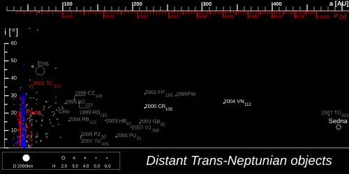 1. ^ 60 minor planets with a semi-major axis greater than 150 AU and perihelion greater than 30 AU are known.[28]