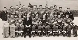 The 1954–55 season ended a run of seven straight regular season titles, an NHL record.[52] During the 1955 off-season, Marguerite Norris lost an intra-family power struggle, and was forced to turn over the Red Wings to her younger brother Bruce.[53] Detroit and Montreal once again met, in the 1956 Stanley Cup Final, but this time the Canadiens won the Stanley Cup, their first of five in a row.[54] In 1957, Lindsay, who had scored 30 goals and led the league in assists with 55, teamed up with Harvey to help start the National Hockey League Players' Association (NHLPA).[55][56] As a result, he and goaltender Glenn Hall were promptly traded to Chicago.[57]