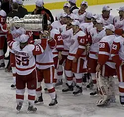 To start the 2007–08 campaign, Zetterberg recorded at least a point in each of Detroit's first 17 games, setting a club record.[167] The Wings cruised to the playoffs, where they faced the Nashville Predators.[168] After goaltender Dominik Hasek played poorly in games 3 and 4 of the series, both losses, head coach Mike Babcock replaced him with Chris Osgood.[169] Osgood never left the net for the remainder of the playoffs, as the Red Wings came back in that series in six games.[170] In the second round, they swept the Colorado Avalanche in four games.[171] They then went on to the Stanley Cup Final after defeating the Dallas Stars in six games in the conference finals.[172] The Red Wings won the Stanley Cup against the Pittsburgh Penguins in game 6 on June 4, 2008, by the score of 3–2. This was the Red Wings' fourth Stanley Cup in 11 years and their 11th overall in franchise history.[173] Zetterberg scored the winning goal in the decisive game, and was also named the winner of the Conn Smythe Trophy as the most valuable player of the playoffs.[173] Lidstrom became the first non-North American player to captain a Stanley Cup-winning team.[174]