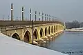 No bridges connected Ontario, Canada and Michigan, US, until the Ambassador Bridge was finished in 1929 and the Detroit–Windsor Tunnel in 1930. Smugglers used boats of varying sizes to transport alcohol across the river during the summer, and during the winter months, rum-runners traveled back and forth across the frozen Detroit River by car. In some cases, overloaded cars fell through the ice. In the 21st century, car parts from this era are occasionally still found on the bottom of the river.[18] Rum-running in Windsor and production of bootleg liquor became common practices. American mobsters such as the Purple Gang of Detroit used violence to control the route known as the "Detroit-Windsor Funnel," and continue to gain lucrative returns from the trade. The name parodied the newly built tunnel between the cities and nations.[19] The Detroit River, Lake St. Clair, and the St. Clair River are estimated to have carried 75% of all liquor smuggled into the United States during Prohibition. Government officials were unable or unwilling to deter the flow.