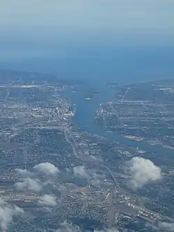 The Detroit River flows for 28 mi (45 km) from Lake St. Clair to Lake Erie.[4] By definition, this classifies it as both a river and a strait — a strait being a narrow passageway connecting two large bodies of water,[5] which is how the river earned its name from early French settlers.[6] However, today, the Detroit River is rarely referred to as a strait, because bodies of water referred to as straits are typically much wider relative to their length. The river forms the southern portion of the waterway connecting Lake Huron to the north and Lake Erie to the south, with other portions including the St. Clair River and Lake St. Clair.