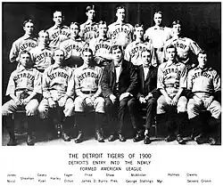 The Tigers were established as a charter member of the now major league American League in 1901.[20] They played their first game as a major league team at home against the Milwaukee Brewers on April 25, 1901, with an estimated 10,000 fans at Bennett Park.[17][21] After entering the ninth inning behind 13–4, the team staged a dramatic comeback to win 14–13.[21] The team finished third in the eight-team league.[22]