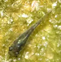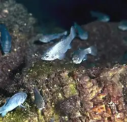 The Devils Hole pupfish (Cyprinodon diabolis) is a critically endangered species of the family Cyprinodontidae (pupfishes) found only in Devils Hole, a water-filled cavern in the US state of Nevada. It was first described as a species in 1930 and is most closely related to C. nevadensis and the Death Valley pupfish (C. salinus). The age of the species is unknown, with differing analyses offering ranges between one thousand and sixty thousand years. It is a small fish, with maximum lengths of up to 30 mm (1.2 in). Individuals vary in coloration based on age and sex: males are bright metallic blue while females and juveniles are more yellow. A defining trait of this species is its lack of pelvic fins. The pupfish consumes nearly every available food resource at Devils Hole, including beetles, snails, algae, and freshwater crustaceans, with diet varying throughout the year. It is preyed on by the predaceous diving beetle species Neoclypeodytes cinctellus, which was first observed in Devils Hole in 1999 or 2000. Reproduction occurs year-round, with spikes in the spring and fall. Females produce few eggs and the survivorship from egg to adult is low. Individuals live 10–14 months.