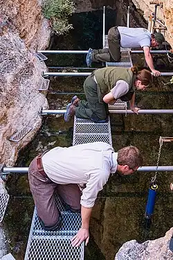 Shortly after 1956, a locked gate was installed in a rock crevice of Devils Hole to limit public access to the site.[5] By 1970, as the shallow shelf was exposed by groundwater depletion, an artificial shelf was installed at Devils Hole. It was never used by the fish.[37] In 2005, 1.7 m3 (60 ft3) of sediment was removed from the shallow shelf to encourage feeding and spawning. While the number of larvae appeared to increase as a result, the population still experienced a net decline over the following year.[54] In January 2006, biologists began supplementing the fish's food supply in response to observations of poor health and malnourishment.[55] After vandalism resulted in the death of a pupfish in 2016, the National Park Service added additional barbed wire to the top of the fences surrounding Devils Hole, also installing more motion sensors and video cameras.[56]