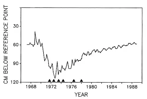 From 1970 through 1996, the average population was 324.[39] Population highs were recorded in 1980, 1990, and 1995 at counts of 541–548 individuals.[28] Since 2005, the population at Devils Hole has been below 200 individuals, although the population fluctuates depending on the season.[66] Low algae growth and other winter conditions cause spring populations to be 35–65% of the autumn population.[39] The reasons for the decline are unclear.[39][67] A 2014 study ascertained that the Devils Hole pupfish had a 26–33% chance of becoming extinct in the next twenty years.[28]