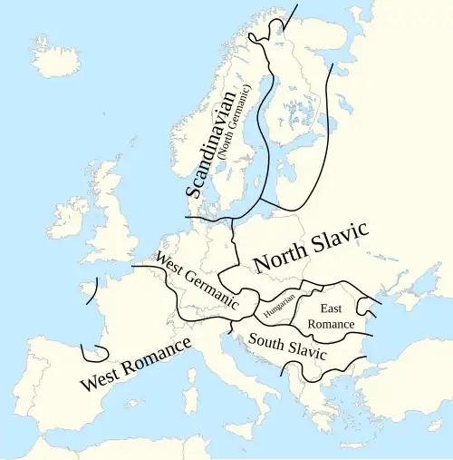 - ^ Carpathian Ruthenia is mistakenly excluded from North Slavic on the map, even though Rusyn, an East Slavic dialect group on the transition to West Slavic, is spoken there.