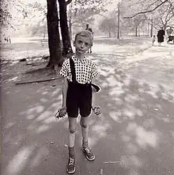 Diane Arbus (/diːˈæn ˈɑːrbəs/; née Nemerov; March 14, 1923 – July 26, 1971[2]) was an American photographer.[3][4] She photographed a wide range of subjects including strippers, carnival performers, nudists, people with dwarfism, children, mothers, couples, elderly people, and middle-class families.[5] She photographed her subjects in familiar settings: their homes, on the street, in the workplace, in the park. "She is noted for expanding notions of acceptable subject matter and violates canons of the appropriate distance between photographer and subject. By befriending, not objectifying her subjects, she was able to capture in her work a rare psychological intensity."[6][7]