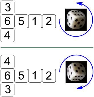 Chirality of dice: Faces may be pla­ced counterclockwise (top) or clockwise.