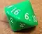 Typical role-playing dice, showing a variety of colors and styles. Note the older hand-inked green 12-sided die (showing an 11), manufactured before pre-inked dice were common. Many players collect or acquire a large number of mixed and unmatching dice.