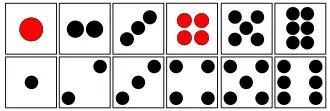 The pips on standard six-sided dice are arranged in specific patterns as shown. Asian style dice bear similar patterns to Western ones, but the pips are closer to the center of the face; in addition, the pips are differently sized on Asian style dice, and the pips are colored red on the one (1) and four (4) sides. The red fours (4) may be of Indian origin.[23][24]