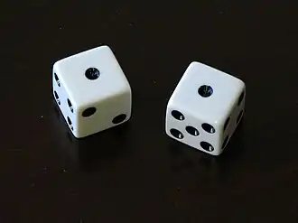 A die (pl.: dice, sometimes also used as sg.)[1] is a small, throwable object with marked sides that can rest in multiple positions. Dice are used for generating random values, commonly as part of tabletop games, including dice games, board games, role-playing games, and games of chance.