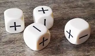 Dice may have numbers that do not form a counting sequence starting at one. One variation on the standard die is known as the "average" die.[38][39] These are six-sided dice with sides numbered 2, 3, 3, 4, 4, and 5, which have the same arithmetic mean as a standard die (3.5 for a single die, 7 for a pair of dice), but have a narrower range of possible values (2 through 5 for one, 4 through 10 for a pair). They are used in some table-top wargames, where a narrower range of numbers is required.[39] Other numbered variations include Sicherman dice and intransitive dice.