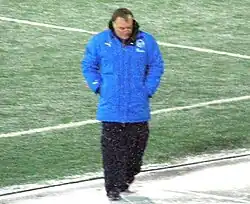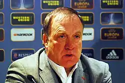 Advocaat was born in The Hague[2] and was a defensive midfielder during his playing days.[4] His career began as an 18-year-old with Hague club ADO Den Haag,[5] and he made his professional debut with the club on 21 May 1967 in a 3–0 win against GVAV.[6] He only featured for Den Haag once more that season,[6] and that summer, the San Francisco Golden Gate Gales franchise imported the Den Haag team, which included Advocaat, to play for six weeks in the United Soccer Association as part of an effort to make the sport more popular in the United States.[7] It was the following season that Advocaat won his only honour as a player, the KNVB Cup, in 1968.[5] In the 1969–70 season, he became a regular in the side, making 29 appearances and scoring his first goal for the club. He made 33 appearances the season after that.[6] From the 1971–72, the club merged with Holland Sport to become FC Den Haag. That season, his final one for the club, Advocaat made a further 66 appearances and scored 6 goals.[6] In total, he made 147 appearances and scored 7 goals for the club.[6]