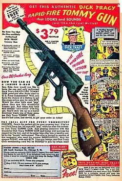 In the 1960s, Aurora produced a plastic model kit of Dick Tracy sliding down a fire escape ladder into an alley, in hot pursuit with gun drawn. A Dick Tracy Space Coupe model came next. Both have been reissued by Polar Lights. Also in the market were Mattel's Dick Tracy range of toy guns.[37]