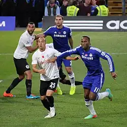 Drogba made his Premier League return for Chelsea in a 3–1 win away to Burnley, replacing winger Eden Hazard in the 84th minute at Turf Moor on 18 August 2014.[137] On 17 September he made the first start of his second spell, in a 1–1 home draw against Schalke 04 in Chelsea's first game of the Champions League group stage.[138] He scored his first goal in his second spell at Stamford Bridge on 21 October, converting a penalty kick in a 6–0 win over Maribor in the Champions League.[139] Five days later, with Chelsea's attack limited by injuries to Diego Costa and Loïc Rémy, Drogba started against Manchester United at Old Trafford, making his 350th appearance for the club. Early in the second-half, he headed in the first Premier League goal of his second spell although Robin van Persie equalised in added time.[140] He scored his 50th goal in European football against Schalke 04.[141]