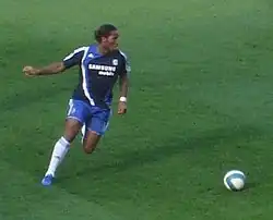Olympique de Marseille signed Drogba on 30 June 2003.[29] He played his first match in his new colours on 2 August 2003, during the first matchday of the 2003–2004 season against his former club, Guingamp. In that season Drogba emerged as one of the highest European scorers. He scored 19 league goals, winning the National Union of Professional Footballers (UNFP) Player of the Year award. He also scored 11 goals in European competitions, five goals in UEFA Champions League and six in the UEFA Cup.[30]