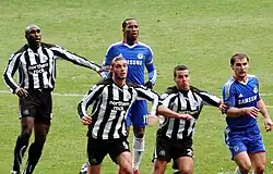 Drogba started the 2005–06 season by scoring two goals in a Community Shield win over Arsenal. His reputation was marred amidst accusations of cheating during Chelsea's 2–0 win over Manchester City. Replays showed that he had used his hand to control the ball before scoring the second of his two goals.[39] This occurred just a week after a similar incident against Fulham where the goal was disallowed.[40] Chelsea went on to retain the league title with two games to play, becoming only the second club to win back-to-back English titles in the Premier League era.[41] Again Drogba finished with 16 goals for the season, 12 in the Premier League, two in the Community Shield, one in the Champions League and one in the FA Cup.[42]