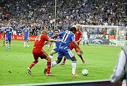 Drogba scored his seventh goal at Wembley Stadium against London rivals Tottenham Hotspur on 15 April, blasting the ball past former teammate Carlo Cudicini as Chelsea became 5–1 winners and secured a place in the FA Cup Final against Liverpool.[106] Three days later, he scored a vital goal as Chelsea beat Barcelona 1–0 at Stamford Bridge in the first leg of their UEFA Champions League Semi-final clash.[107] Drogba became the first player to score in four different FA Cup Finals, as he netted the winner in Chelsea's 2–1 triumph over Liverpool on 5 May.[108] He also holds the record for most goals scored at the new Wembley Stadium with eight.[109]
