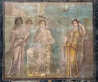 Aeneas, a Trojan prince who fled Troy after it fell to the Greeks, eventually landed on Carthage's shores after many years of wandering.[16] Dido welcomed him warmly, having heard word about his exploits, and arranged a feast. However, Venus, Aeneas' mother, sensed that Dido and Carthage were under Juno's control. As leverage, she gave her son a dart that would make Dido fall madly in love with him. At the feast, Aeneas used the dart on Dido, and she was filled with a powerful, all-encompassing love and desire for him.[19] However, she was conflicted, as she had sworn never to remarry after her first husband was killed.[20] Juno became aware of Venus' actions, and proposed that they marry the couple and join the pair's kingdoms. By the goddess' design, the pair consummated their relationship in a cave.[21] However, while Dido called Aeneas her husband, Aeneas claimed they were never officially married.
