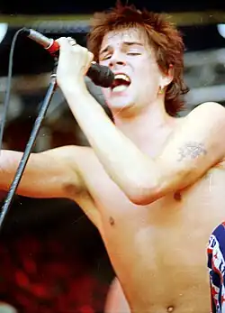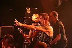 All band members are self-taught musicians. At the beginning of their musical career most of them were still at school. Their first album was recorded in a studio rented by the hour.[26] The band kept to simple guitar chords and lyrics, in garage style. Die Toten Hosen were mainly influenced by punk bands from the 1970s, to whom they frequently pay tribute in recorded work and live performances. On occasion they have played songs by the Beatles and the Rolling Stones. Some of the band's songs have been described as "Schunkelpunk", a fusion of German schlager music and punk, exemplified by "Eisgekühlter Bommerlunder", numerous cover versions of German schlager songs and tracks such as "Azzurro". They can be seen as pioneers of "Volxmusic",[27] which combines elements of German folk music with jazz, hip-hop or rock. In some of their songs Die Toten Hosen experiment with strings or wind instruments. A few songs have elements that are lifted from jazz (e.g. "Warum werde ich nicht satt"), reggae ("Zehn kleine Jägermeister") or Yugoslavian gypsy music ("Das Mädchen aus Rottweil").